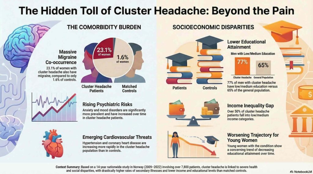 These findings characterize cluster headache as a complex disease that requires specialized, individualized therapy and consistent clinical follow-up. The dual burden of health complications and socioeconomic disadvantages highlights the distinct vulnerability of this patient group. Clinicians and policymakers must recognize that effective management necessitates a comprehensive approach that addresses both the clinical comorbidities and the broader social implications of the condition to mitigate long-term disability.