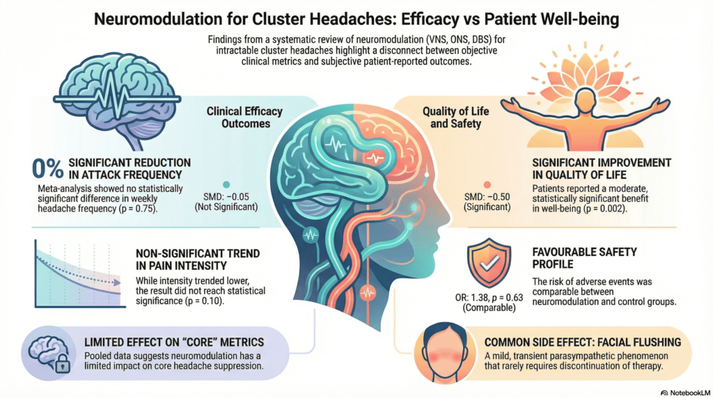 The findings of this meta-analysis offer a critical evaluation of the distinction between symptom suppression and overall patient well-being. When looking strictly at the primary efficacy outcomes, the data revealed no statistically significant difference in headache attack frequency or pain intensity between patients receiving neuromodulation and those in control groups. Specifically, the meta-analysis showed a standardized mean difference (SMD) for attack frequency of -0.05 (95% CI: -0.36 to 0.26, p = 0.75). Similarly, while pain intensity showed a slight downward trend, it did not meet the threshold for statistical significance with an SMD of -0.26 (95% CI: -0.57 to 0.05, p = 0.10).