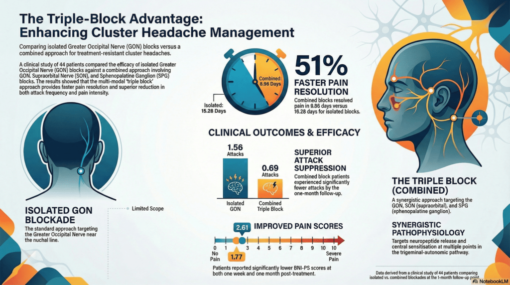This study provides compelling evidence that combining GON, SON, and SPG nerve blocks represents a necessary evolution in the management of cluster headache. The results suggest a paradigm shift from isolated nerve blocks to multi-point interventional strategies, particularly for treatment-resistant patients who require rapid and potent relief. By targeting various neuropeptides and central sensitization mechanisms simultaneously, clinicians can achieve faster pain resolution and a significantly lower attack burden than previously possible with standard methods.