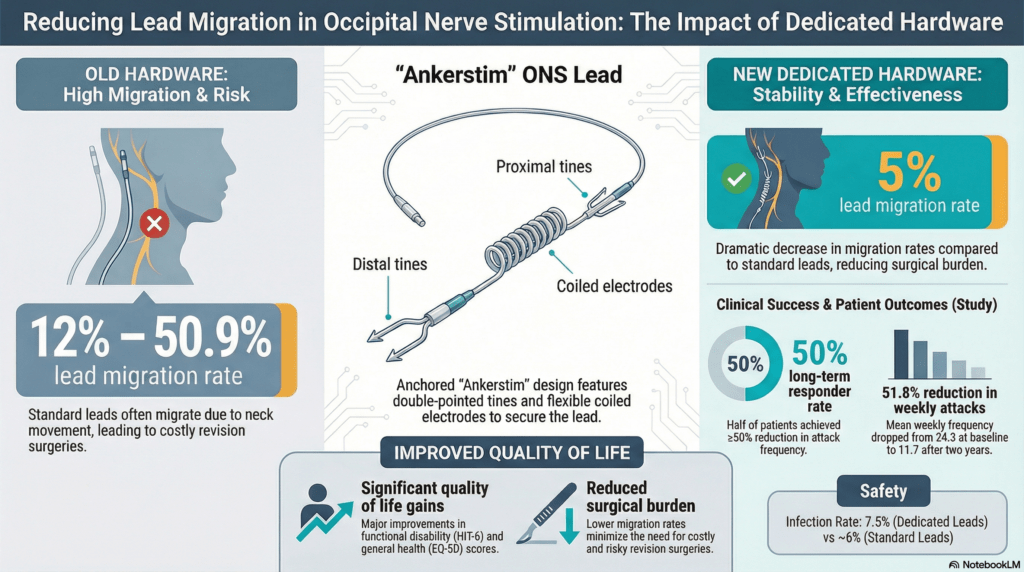 These findings provide high strategic value for clinicians determining treatment pathways for patients who are refractory to standard care. By providing a more stable and reliable hardware option, ONS can be considered with greater confidence for those suffering from the extreme disability of chronic cluster headaches. The 5% migration rate achieved with dedicated leads directly mitigates the global burden and costs associated with revision surgeries, strengthening the case for the cost-effectiveness of this approach.