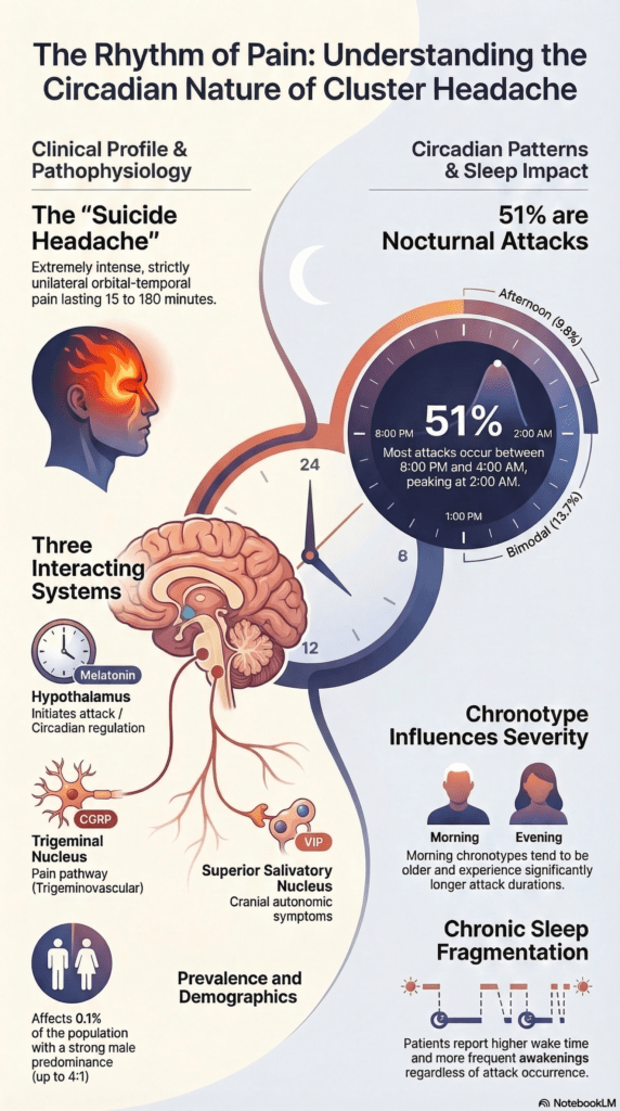 These findings underscore the profound connection between the hypothalamic biological clock and the clinical burden of cluster headache. Within the scope of this Italian cohort, the evidence suggests that the disease is as much a rhythm disorder as it is a pain disorder. Consequently, there is a strong argument for the strategic importance of restoring sleep quality as a primary therapeutic goal in CH management. Clinicians should view the stabilization of circadian health as a central component of comprehensive care for those living with the condition.