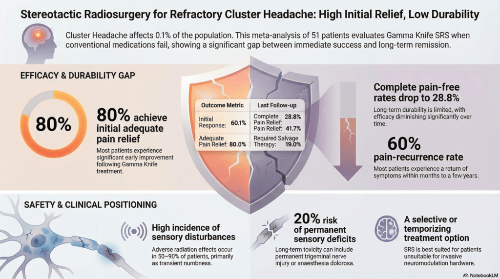 Current first-line therapies for cluster headache include oxygen, triptans, and preventive medications such as verapamil. However, for patients who do not respond to these treatments, the search for non-destructive alternatives to historical ablative procedures, which often caused facial numbness and deafferentation pain, has led to the exploration of SRS. While the technical precision of SRS is exceptionally high, the clinical results synthesized in this review reveal a complex narrative regarding the durability of its effects.