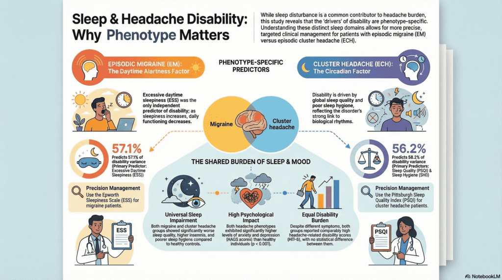 Headache disorders remain a leading cause of years lived with disability, often resulting in significant social and economic burdens. While the link between poor sleep and headache frequency is well documented, this study aimed to identify which specific sleep factors, such as hygiene, quality, or daytime sleepiness, serve as independent predictors of functional impairment. To ensure the integrity of the data, the research was conducted during interictal periods. This was defined as at least 48 hours following a migraine attack for EM patients or during a period of remission outside of an active cluster cycle for ECH patients. Crucially, none of the participants were receiving prophylactic headache treatments or psychiatric medications during the study. This exclusion of preventative therapy is vital as it ensures the observed sleep disturbances were not skewed by medications that commonly alter sleep architecture or autonomic function.