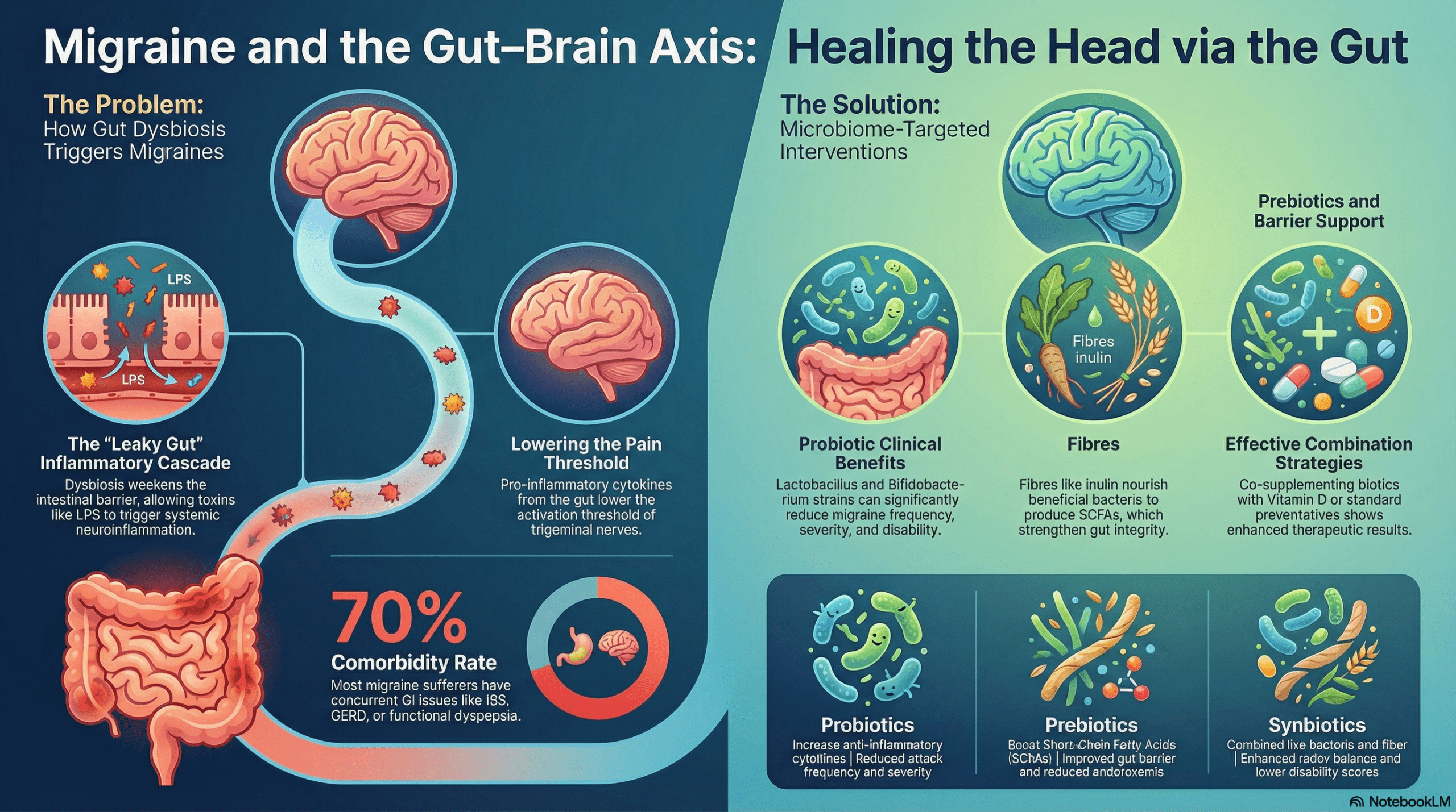 The bidirectional communication between the central nervous system and the gastrointestinal tract, known as the gut-brain axis, is a vital area of inquiry for the 70% of migraine patients who experience comorbid gastrointestinal disorders. Standard pharmacological treatments often prove insufficient for these patients, largely because they do not address the underlying “leaky gut” (increased intestinal permeability). When the intestinal barrier is compromised, the translocation of lipopolysaccharides (LPS) from Gram-negative bacteria into the systemic circulation activates Toll-like receptor 4 (TLR4). This process triggers a cascade of pro-inflammatory cytokines and chronic low-grade inflammation, which effectively lowers the activation threshold for neural sensitization. These biological mechanisms suggest that the gut serves as a critical upstream modulator for the neurovascular signals observed in clinical migraine trials.