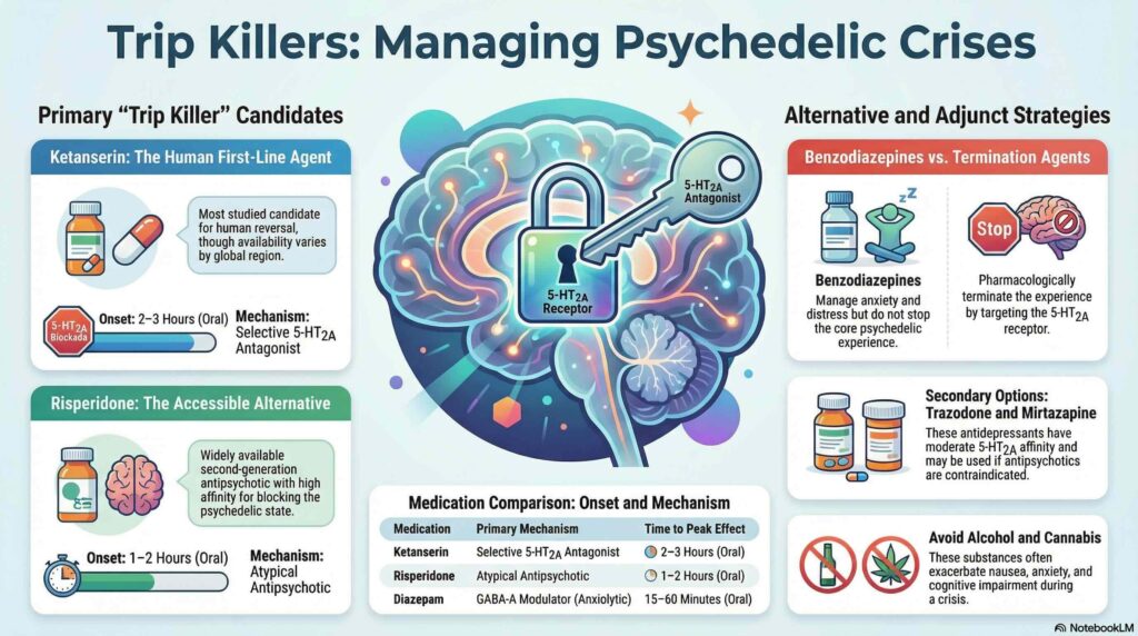 This review clarifies the pharmacological landscape for managing psychedelic-induced distress, identifying specific 5-HT2A antagonists and atypical antipsychotics as effective interventions. While several medications show promise, the current recommendations remain largely theoretically grounded and require rigorous clinical validation through human trials to establish standardized safety protocols. Future research must bridge this knowledge gap to ensure that pharmacological “trip killers” are used proportionally and safely within broader supportive care frameworks.