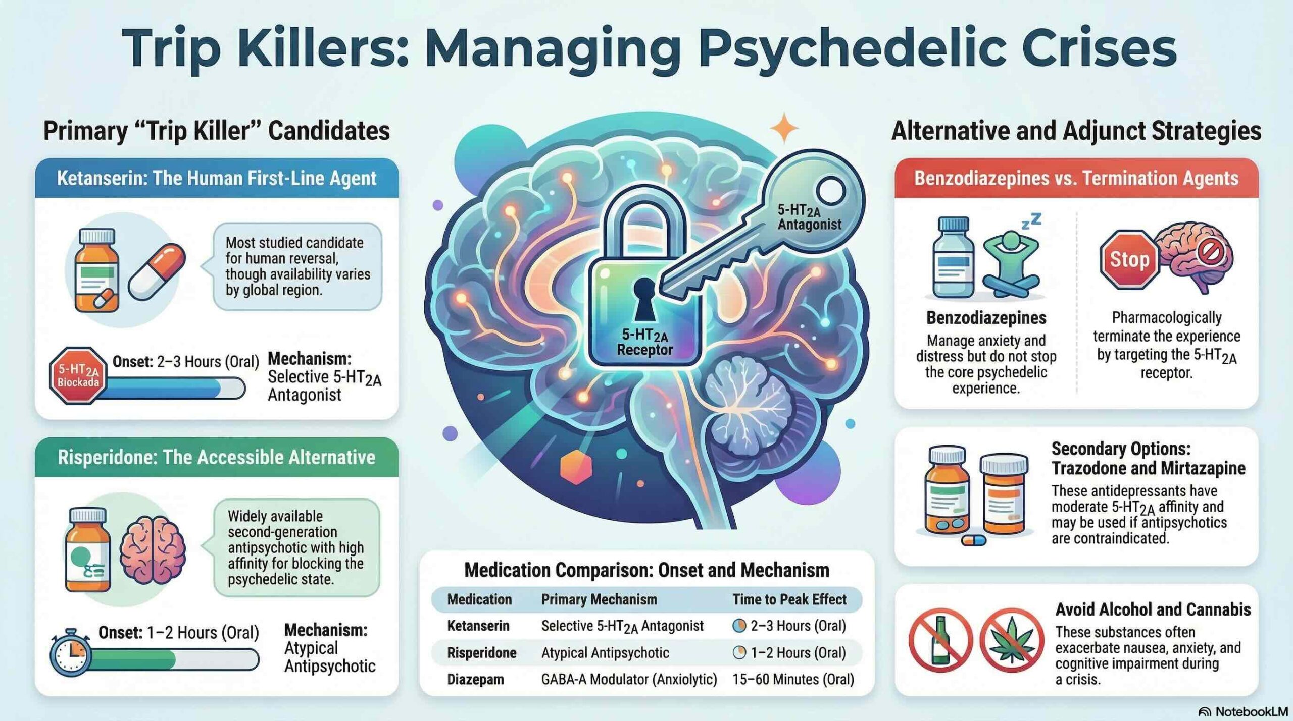 Due to their widespread availability, atypical antipsychotics serve as the leading practical alternatives for clinicians. Risperidone is a primary candidate due to its high 5-HT2A affinity and potent functional profile; notably, the review cites data indicating that 1 mg of risperidone can block 98% of psilocybin’s effects. In contrast, first-generation antipsychotics like Haloperidol should be avoided in these contexts, as they lack significant 5-HT2A activity and may be detrimental, potentially exacerbating anxiety without reducing hallucinatory symptoms. Other candidates include Trazodone, which possesses moderate 5-HT2A affinity, while benzodiazepines provide symptomatic relief through anxiolysis and sedation rather than directly terminating the core psychedelic state.
