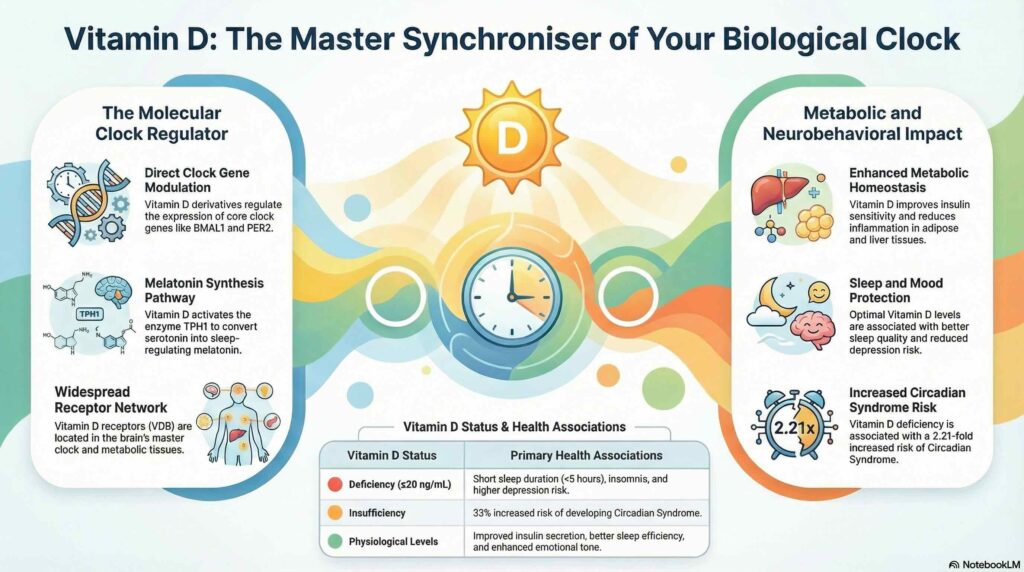 In the 21st century, human populations face widespread circadian disruption driven by the constant use of artificial light sources and various sleep disorders. This chronic misalignment between internal rhythms and the external environment has led to the emergence of the “circadian syndrome,” a concept that expands the definition of metabolic syndrome to include sleep disturbances and depression as core components. Notably, research suggests that the circadian syndrome is a stronger predictor for cardiovascular disease than the metabolic syndrome alone. This narrative review evaluates vitamin D as a bioactive compound that may play a significant role in synchronizing the circadian clock and mitigating the risks associated with metabolic and rhythmic imbalances.