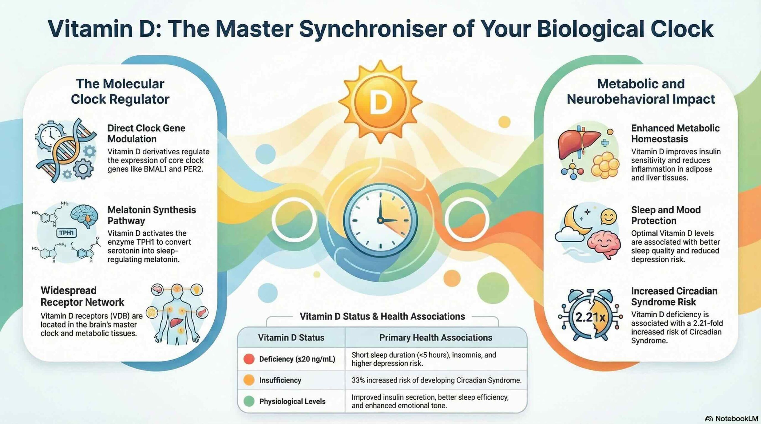 Vitamin D serves as a promising regulator of both circadian rhythm and metabolic homeostasis, offering potential benefits for individuals living in environments characterized by significant light pollution. Within the scope of current evidence, it is clear that vitamin D influences the synchronization of the clock machinery with environmental cues, relying on its chronobiological action to facilitate the phase-shifting of physiological rhythms. However, future research must determine the optimal timing for vitamin D administration and account for individual susceptibility to ensure effective clinical application.